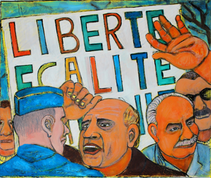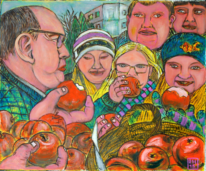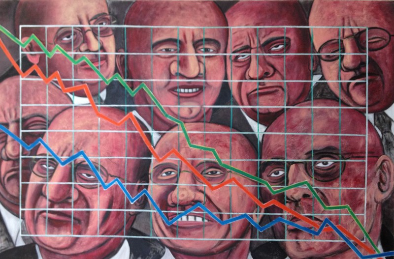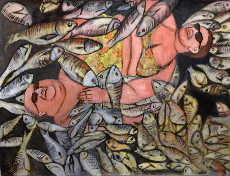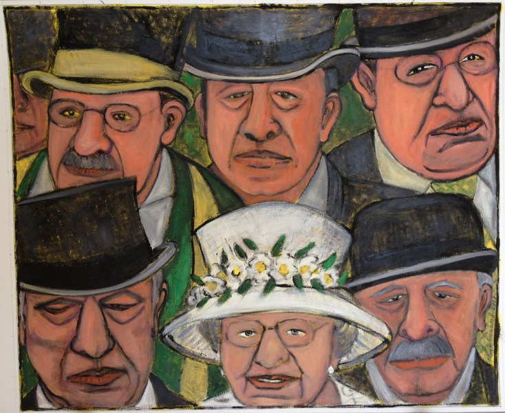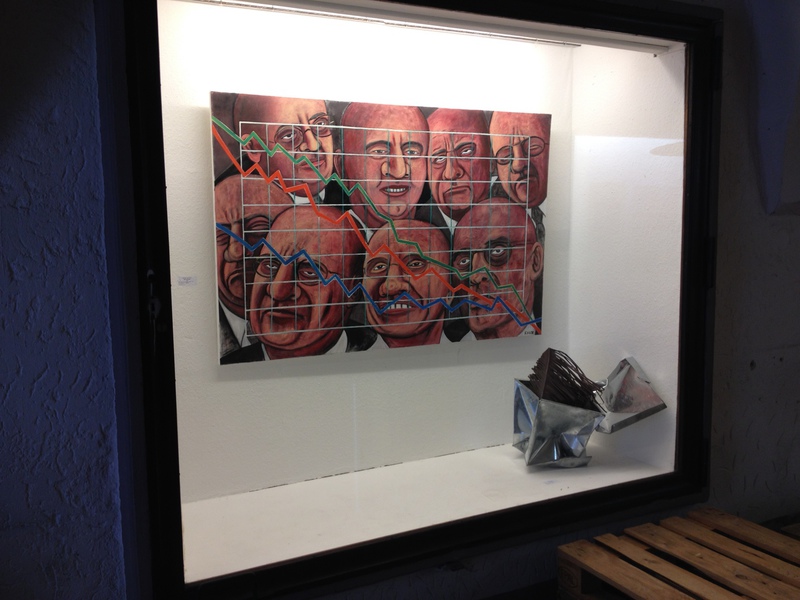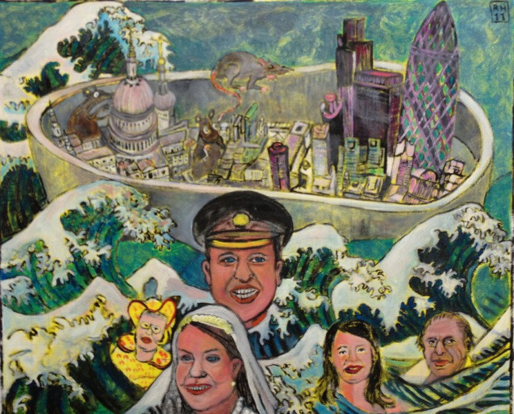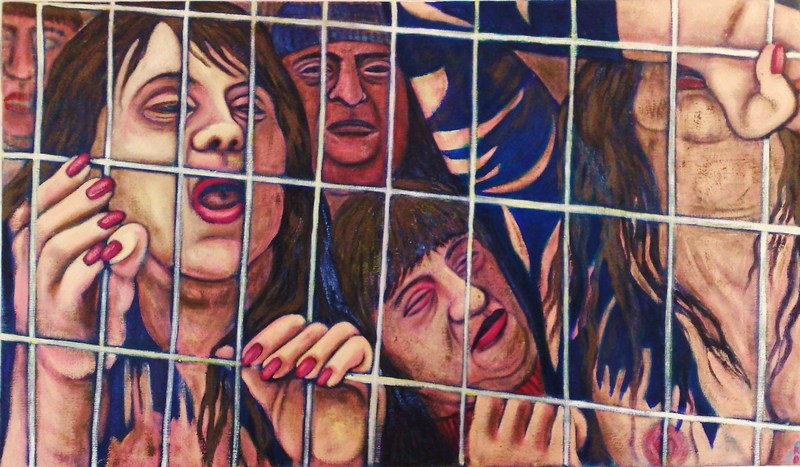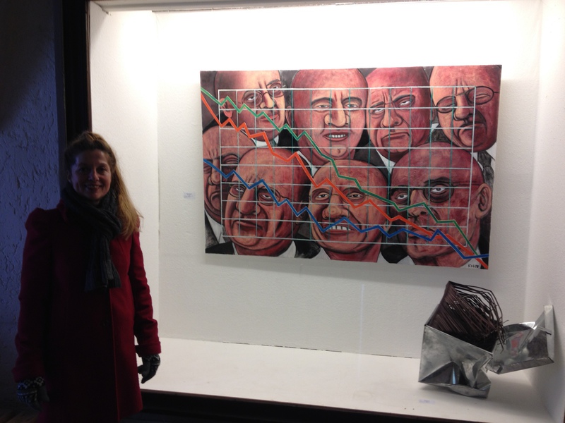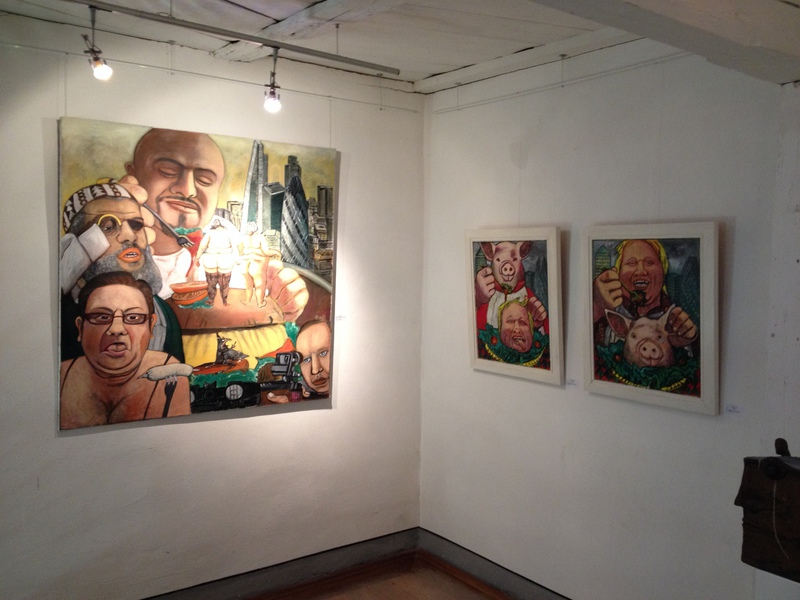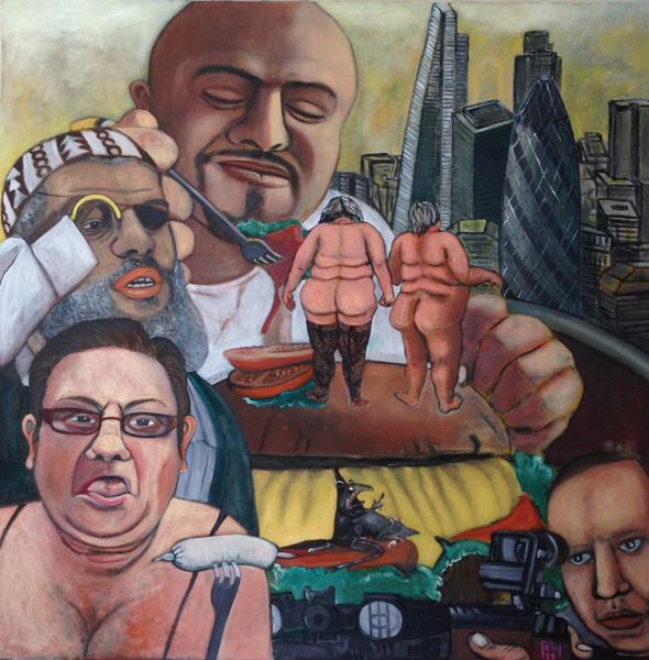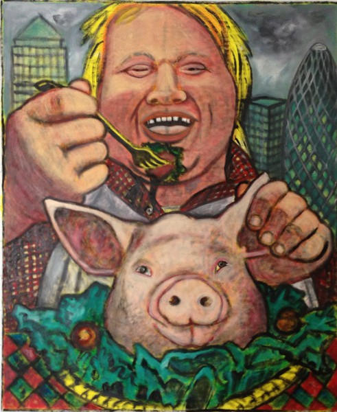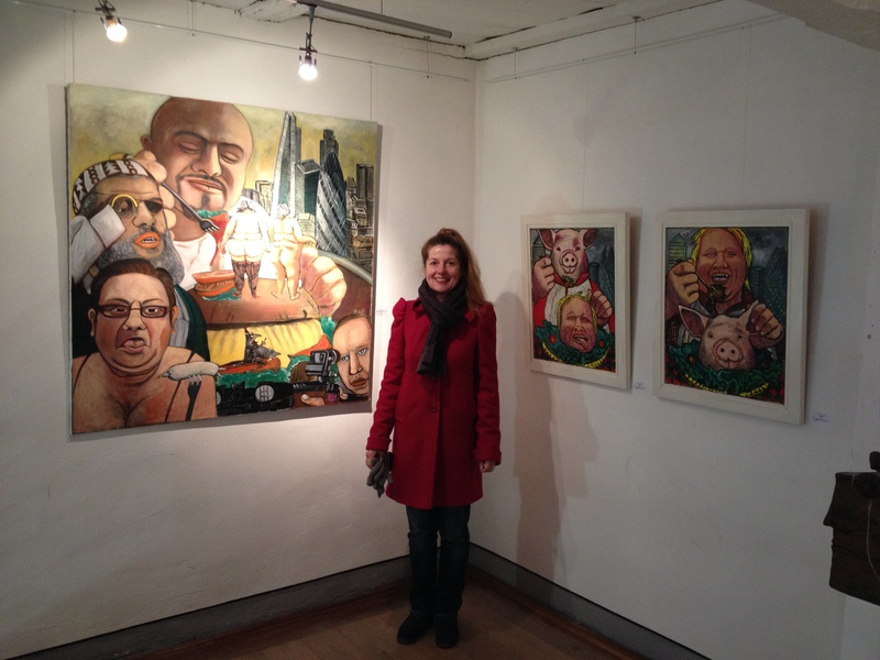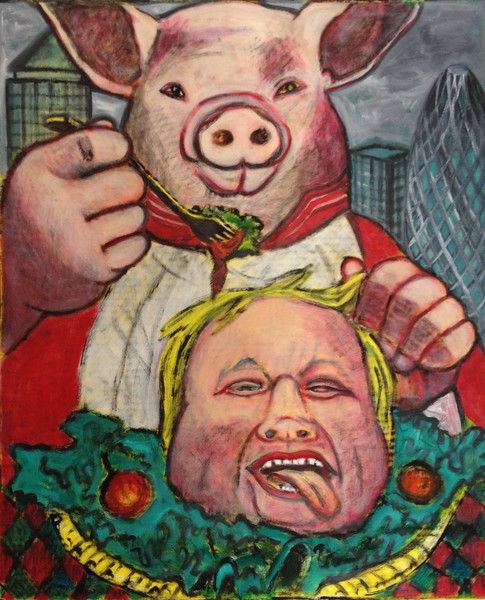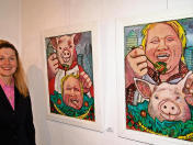 Her works are characterised by strong, almost garish colours. "Otto Dix was my role model even as I was studying " she revealed. Her images often contain irony, nasty satire and biting social criticism. Two adjacent hanging works show a person eating a pig's head, and a pig consuming a human head. It was London that inspired her to paint these two images, the city's super rich, in the reigns of capitalism, she revealed.
