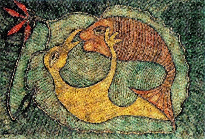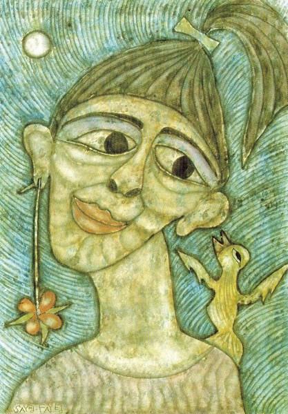 Sayed Amin Fayed was a dreamer and a philosopher. Originally he shaped stones into ambiguous figures. Some of his pictures show traces of his sculpture work. He also paints beings of water and skies, adorning them with flowers. Then again, in a desire for harmony, he expresses his vision of a peaceful co-existence of all religions and the unity of all living things. Within this idealistic view, he depicts plants, animals and men ambiguously melting into each other and growing out from one another.