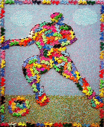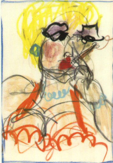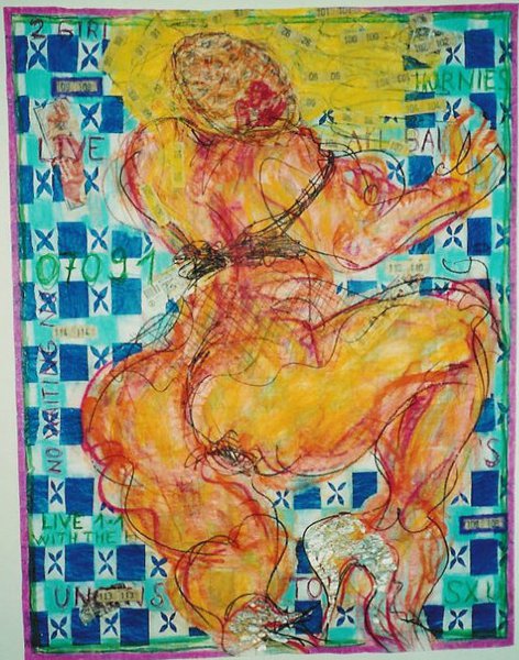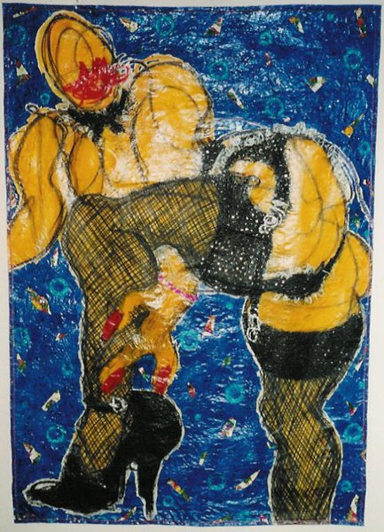 Born in Johannesburg, I was inspired by the vitality and richness of colour, which surrounded me in South Africa. I often find it interesting to mix my drawings with materials, exploring especially the infinite possibilities of our consumer's world, for example cosmetic pads, coffee filters, pencil sharpener residue, plastic, quilt, textile, aluminium foil, balloons, stickers... Inspiration is everywhere. Popular culture, street life, folklore, travelling, opera, ballet, theatre, daily life experiences and observations. An important aspect is also the notorious humour of the Anglo-Saxon culture.
