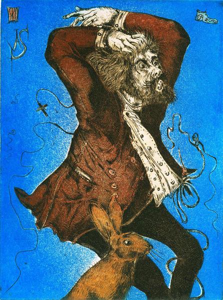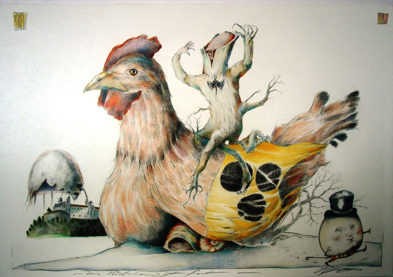 Stephan Klenner-Otto makes drawings and etchings on topics such as Richard Wagner, Jean Paul, ETA Hoffmann, Goethe and bizarre fantastical narrative images.
