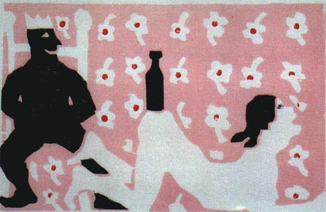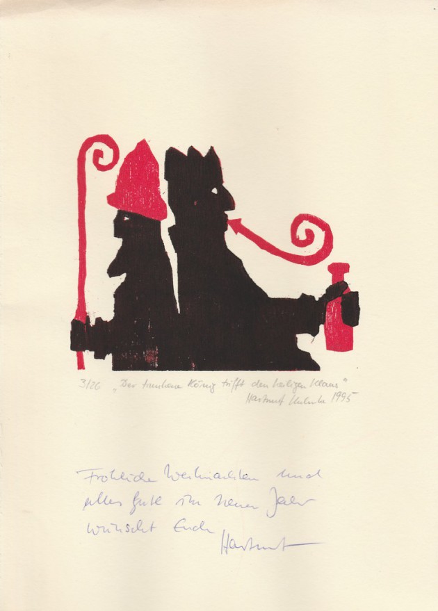 Hartmut Kuhnke (b. 1950): DER TRUNKENE KÖNIG TRIFFT DEN HEILIGEN KLAUS, 1995, Coloured woodcut, Image 11,5 x 14 cm, Sheet size 21 x 29 cm, Edition 3 of 26