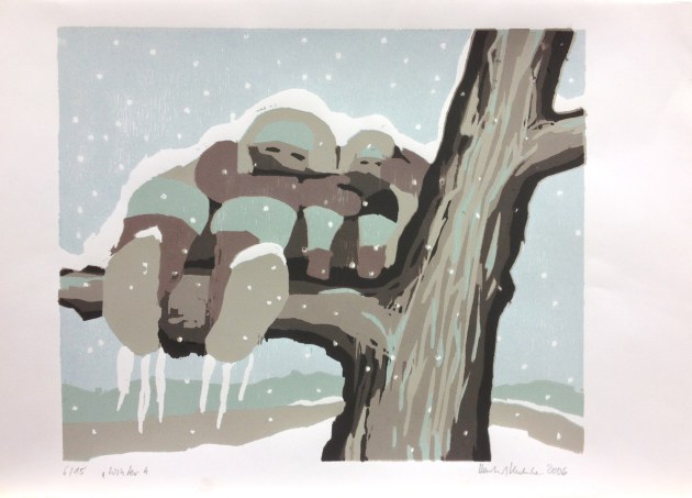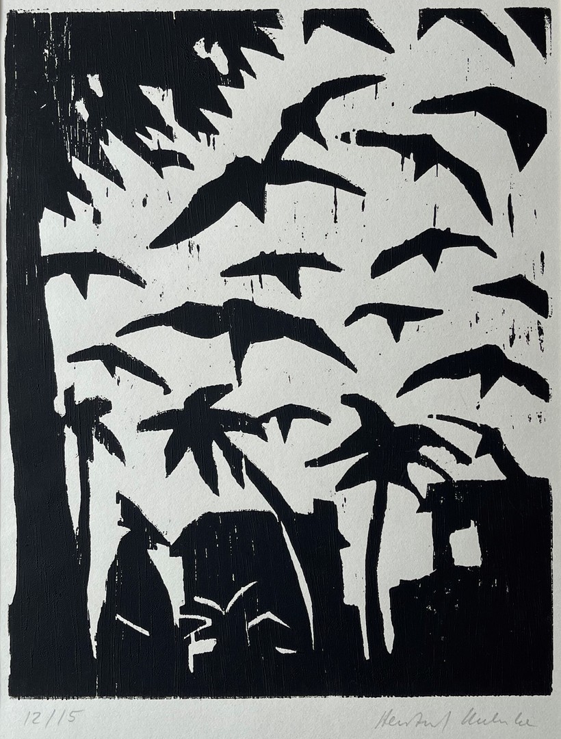 Hartmut Kuhnke (b. 1950): WEIHNACHTSVÖGEL, 2009, Coloured woodcut, Image 11 x 14,5 cm, Sheet size 21 x 15 cm, Edition 22 of 37