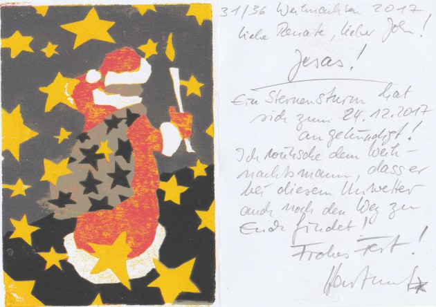 New Year greetings 2018 from Hartmut Kuhnke to J. & R. Hammond with inscription (Liebe Renate, lieber John! Jesas! Ein Sternensturm hat