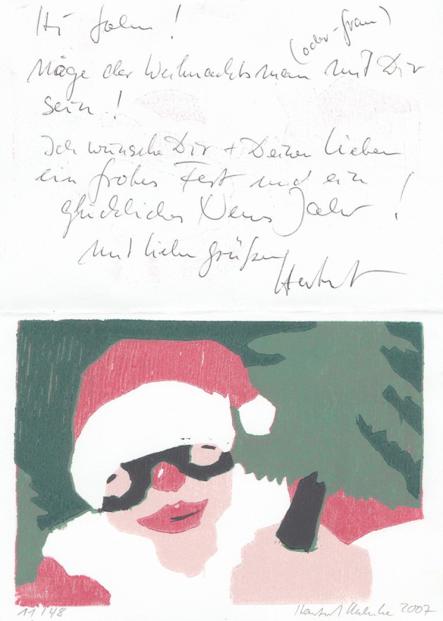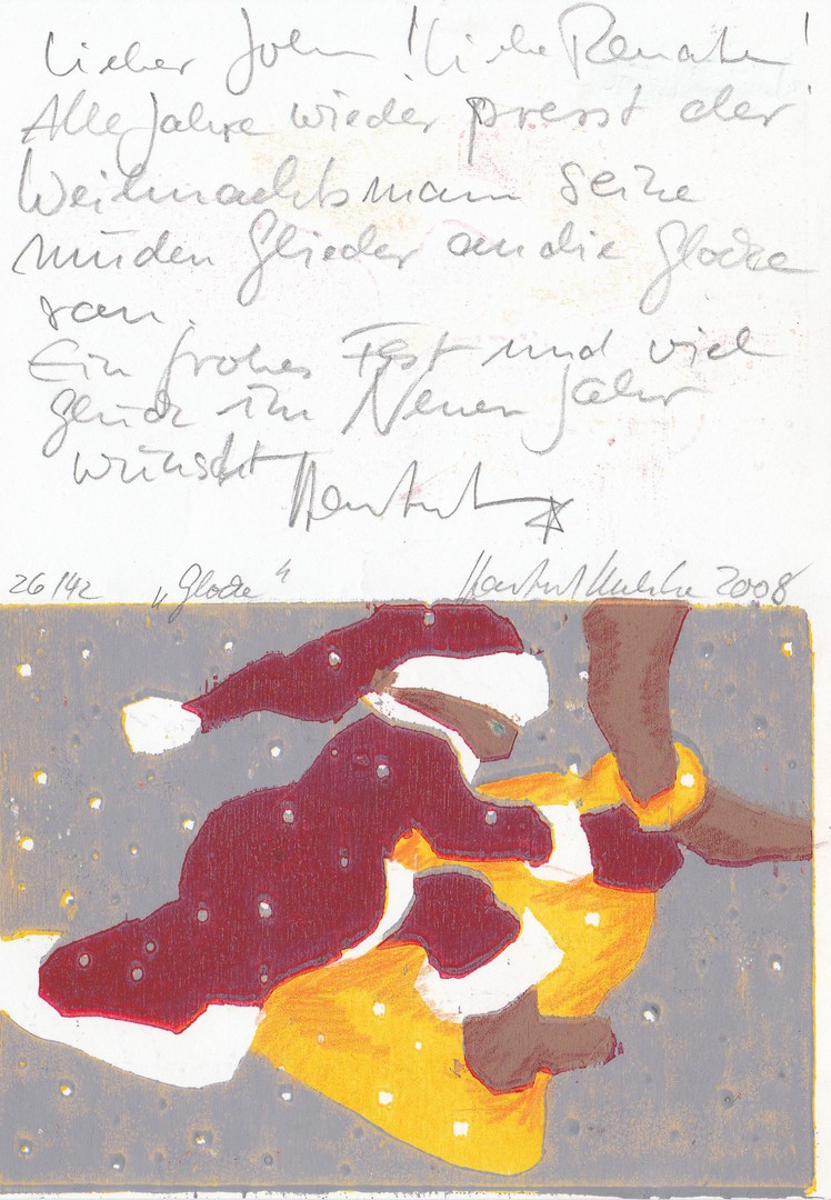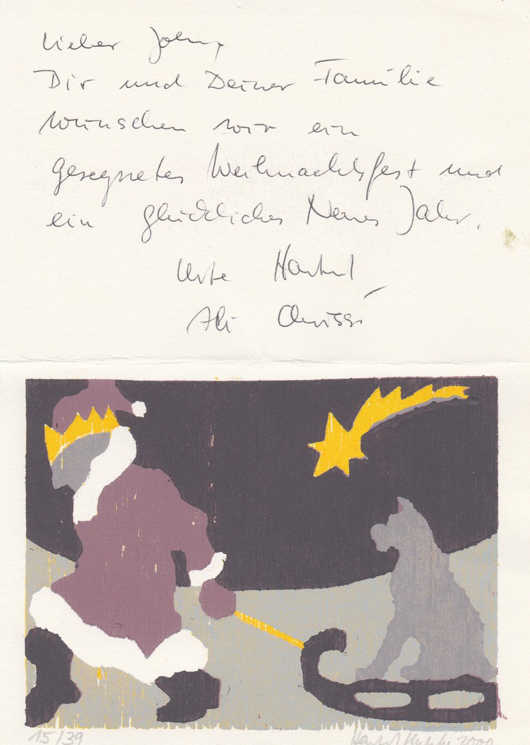 New Year greetings 2009 from Hartmut Kuhnke to J. & R. Hammond with inscription (Lieber John! Liebe Renate! Alle Jahre wieder, presst der Weihnachtsmann seine müden Glieder an die Glocke ran. Ein frohes Fest und viel Glück im Neuen Jahr wünscht Hartmut).