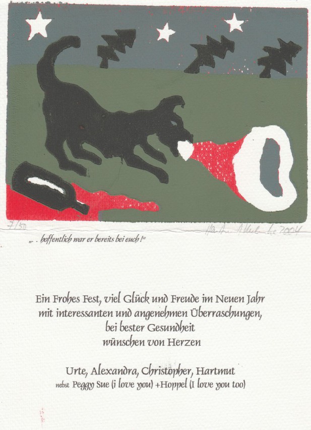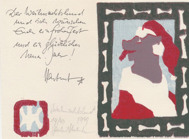 New Year greetings 2000 from Hartmut Kuhnke to J. & R. Hammond with inscription (Der Weihnachtshund und ich wünschen Euch ein