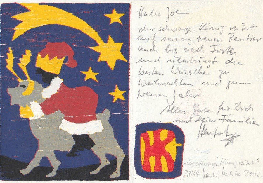 New Year greetings 2003 from Hartmut Kuhnke to J. & R. Hammond with inscription (Hallo John, der schwarze König reitet auf seinem treuen Rentier auch bis nach Fürth und überbringt die besten Wünsche zu Weihnachten und zum Neuen Jahr. Alles Gute für Dich und Deine Familie Hartmut).