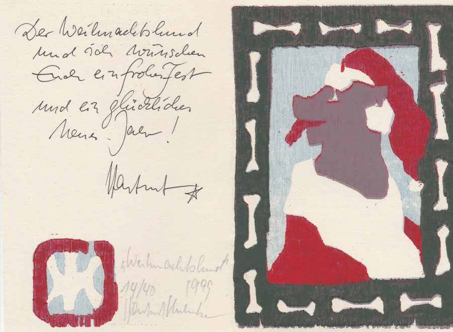 Hartmut Kuhnke (b. 1950): WEIHNACHTSHUND (CHRISTMAS DOG), 1999, Woodcut, Image 11 x 15cm, Sheet size 15,5 x 22 cm, Edition 14 of 40
