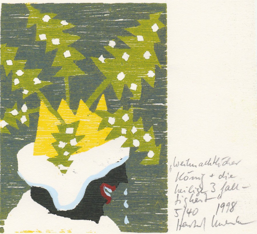 Hartmut Kuhnke (b. 1950): WEIHNACHTLICHER KÖNIG + DIE HEILIGE 3 FALLTIGKEIT, (CHRISTMAS KING AND THE HOLY TRINITY), 1998, Woodcut, Image 13,5 x 10 cm, Sheet size 15 x 21 cm,