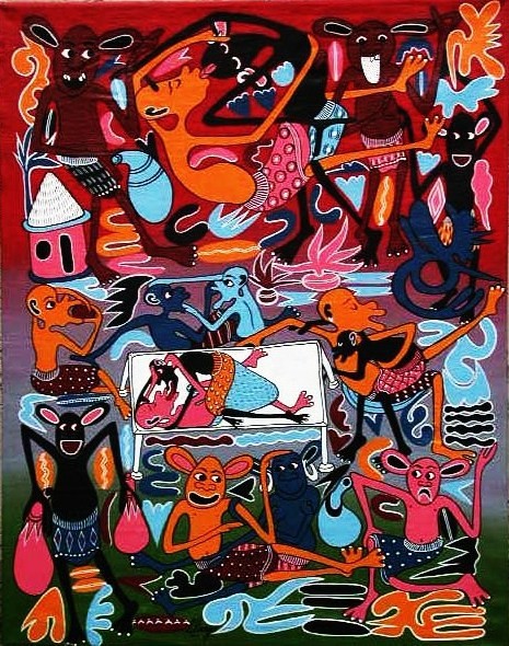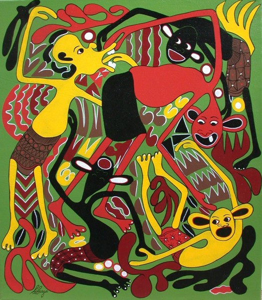 George Lilanga’s paintings were heavily influenced by the traditional Makonde wood carving style and when he in 1980 encountered the paintings of the Tingatinga School which was established by the followers of Eduardo Saidi Tingatinga (1939 - 1972); this had a profound effect on his future work. George Lilanga’s carved wood figures, dressed in modern fashions and using conveniences like radios and telephones, move beyond their traditional roots and become caricature and social criticism of contemporary African culture.