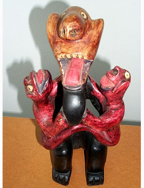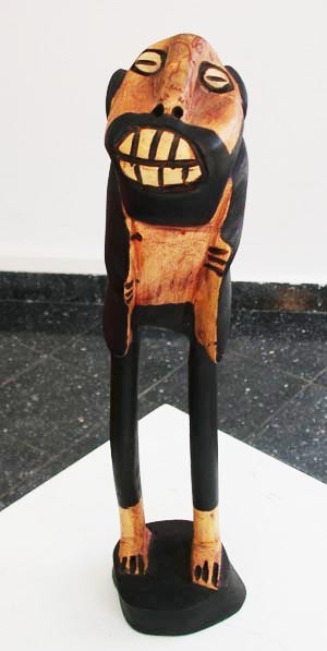 Isaia Manzini produces, brightly painted wooden caricaturical sculptures that illustrate Zimbabwian proverbs and stories of everyday life in a refreshingly humorous way.
