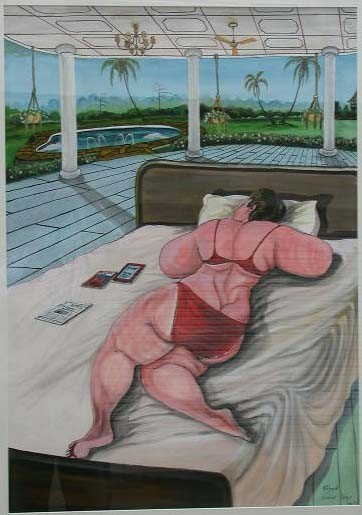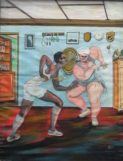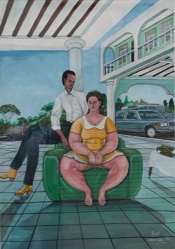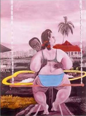 The unreal theatricality of largely self-taught artist Richard Onyango’s paintings turn the spectator in a helpless or complicit participant of the events which he describes. The psychological tension is notably present in the paintings that Richard Onyango dedicated to his relationship with Drosie. White and curvaceous, the young woman represents in imaginary or real situations the fantasies that Africa projects onto the west.