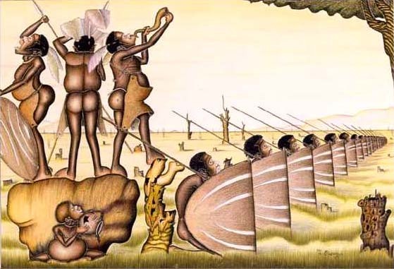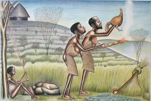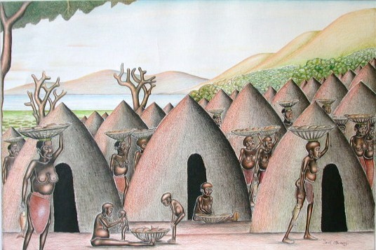 Joel Oswaggo moved to Uganda where he found work as painter and sign writer for a Construction Company from Italy. There his talent was discovered by an Italian colleague called Oresto. He and other Italians where buying pictures from Joel Oswaggo and sending them to Italy as gifts. After five years he returned to Kenya to deal with family commitments. He could not return to Uganda due to the outbreak of the Ugandan Civil war. In 1974 Joel Oswaggo moved to Kisumu to find a market for his paintings and was surviving in the meanwhile as vegetable vendor with a wheelbarrow in the market. It was at Kisumu that he came to know of Gallery Watatu of Nairobi.
