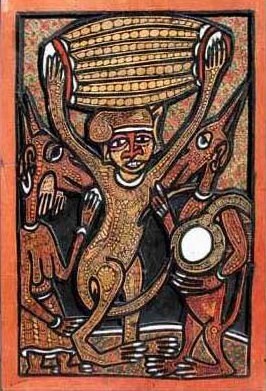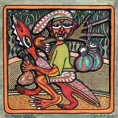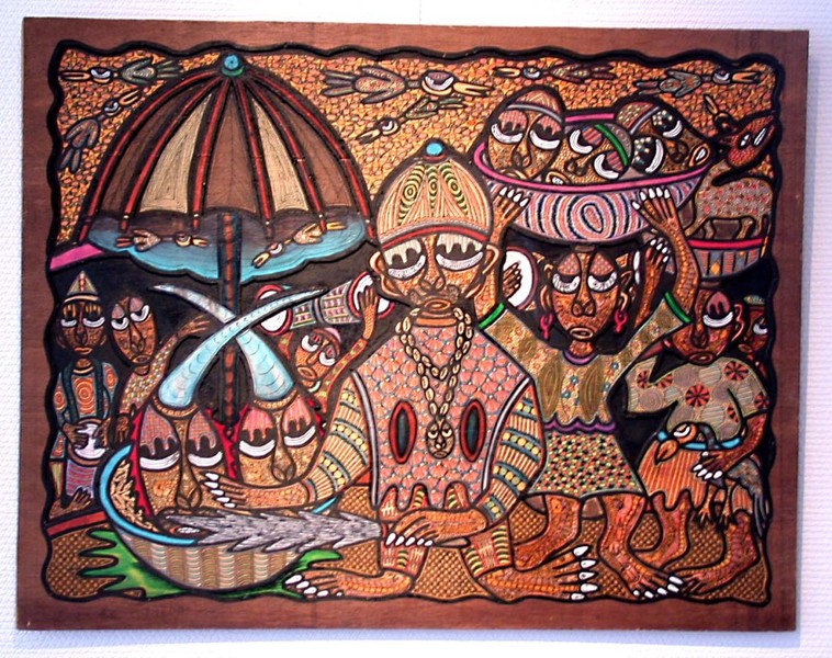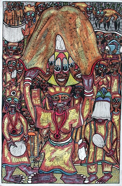 He was a painter, sculptor and musician. His work is influenced by traditional Yoruba mythology and culture and creates a fantastic universe of humans, animals, plants and Yoruba gods. His brightly coloured intricately patterned paintings evoked the world of Yoruba folklore and religion.